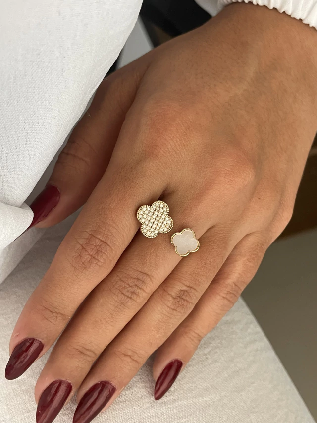 Anel trevos G regulável com madrepérola e zircônias banhado a ouro18k