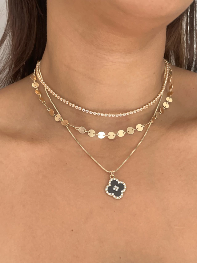 Colar com pingente de trevo preto e zircônias banhado a ouro18k