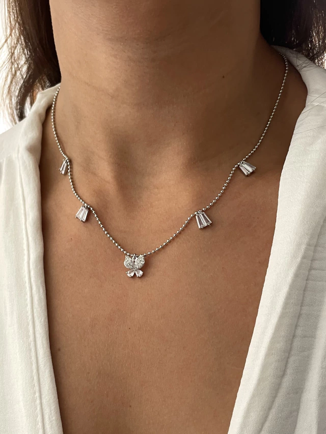 Colar delicado borboleta com zircônias navete banhado a prata