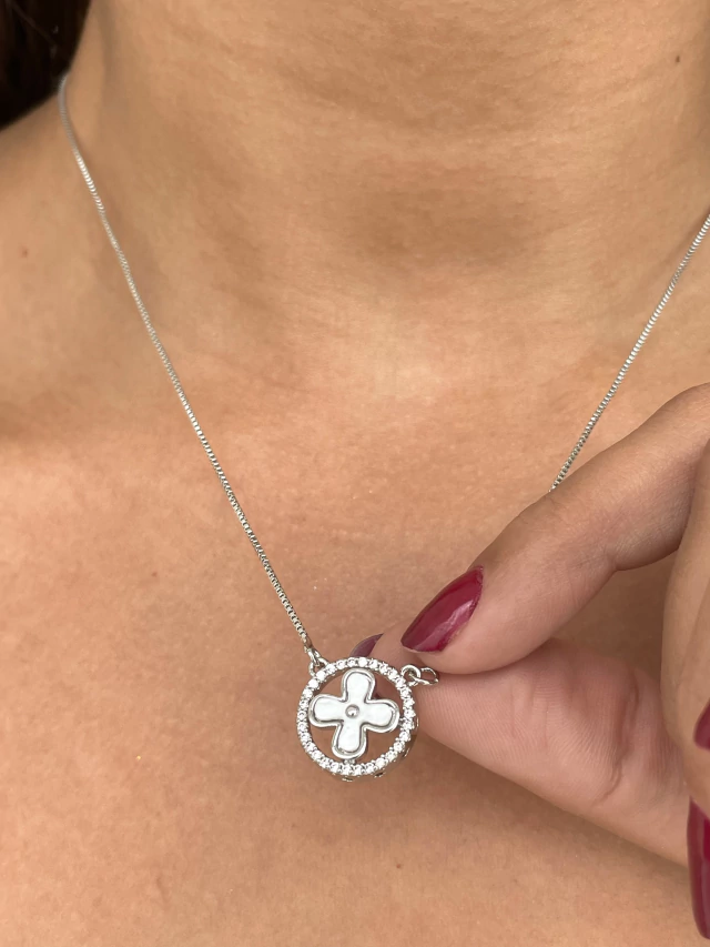 Colar trevo tipo madrepérola com zircônias banhado a prata