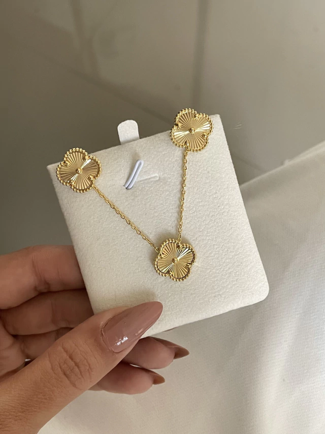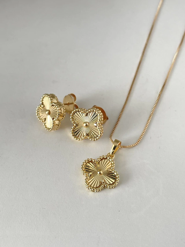 Conjunto colar e brinco trevo clássico aço inox dourado