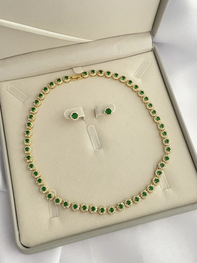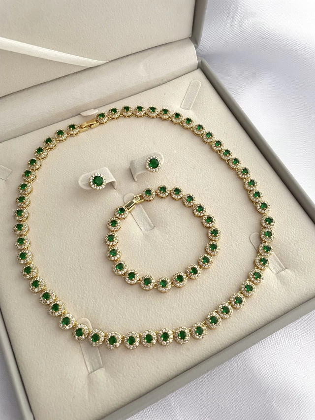 Conjunto prime Ariana círculo de zircônias verde banhado a ouro18k