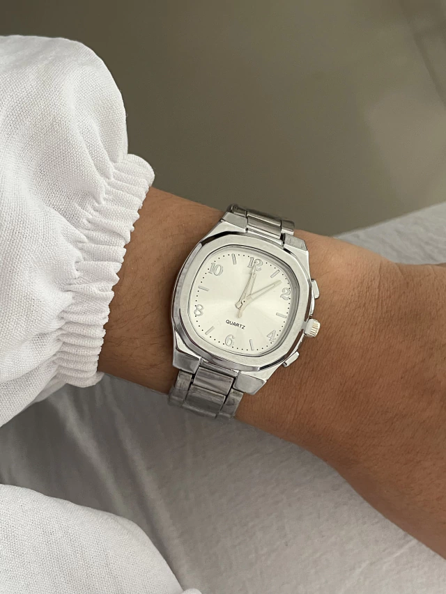 Relógio quadrado com detalhes oval prata