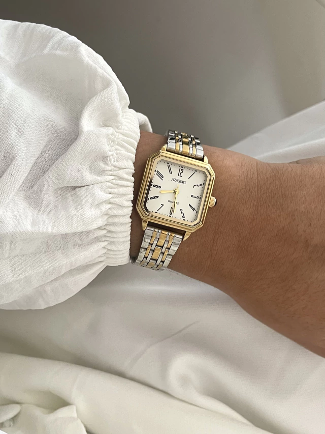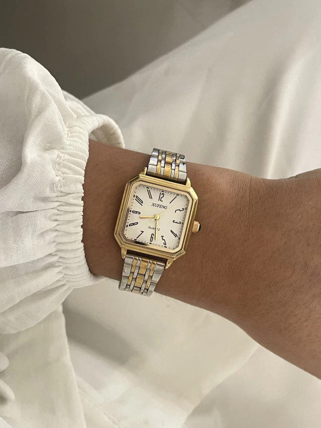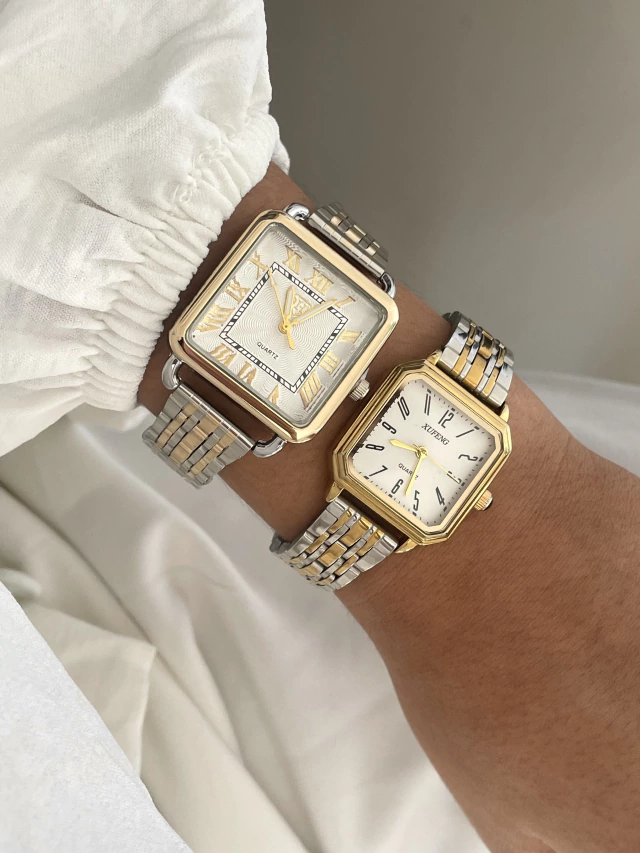 Relógio quadrado P de aço e a prova d’água prata com dourado
