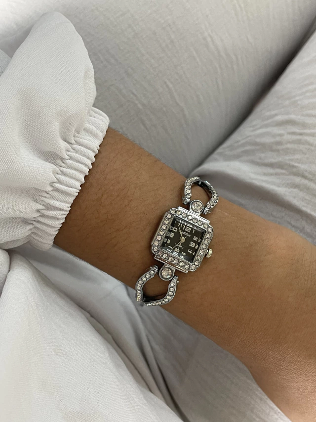 Relógio quadrado P de cristais prata com preto
