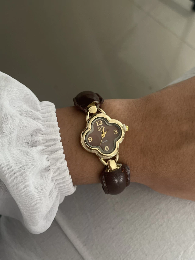 Relógio trevo dourado pulseira marrom